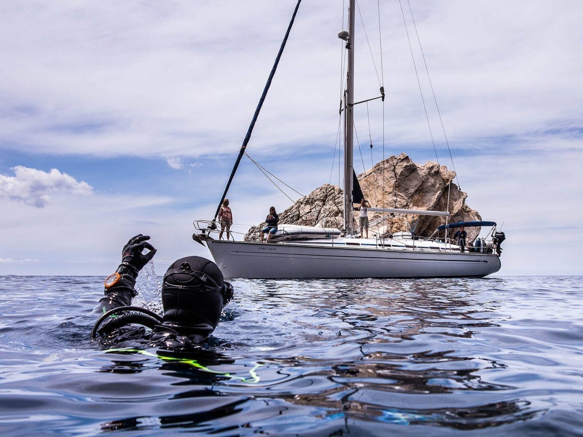 Un velero preparado para poder realizar inmersiones: compresor, equipos de buceo, embarcación auxiliar, etc...
