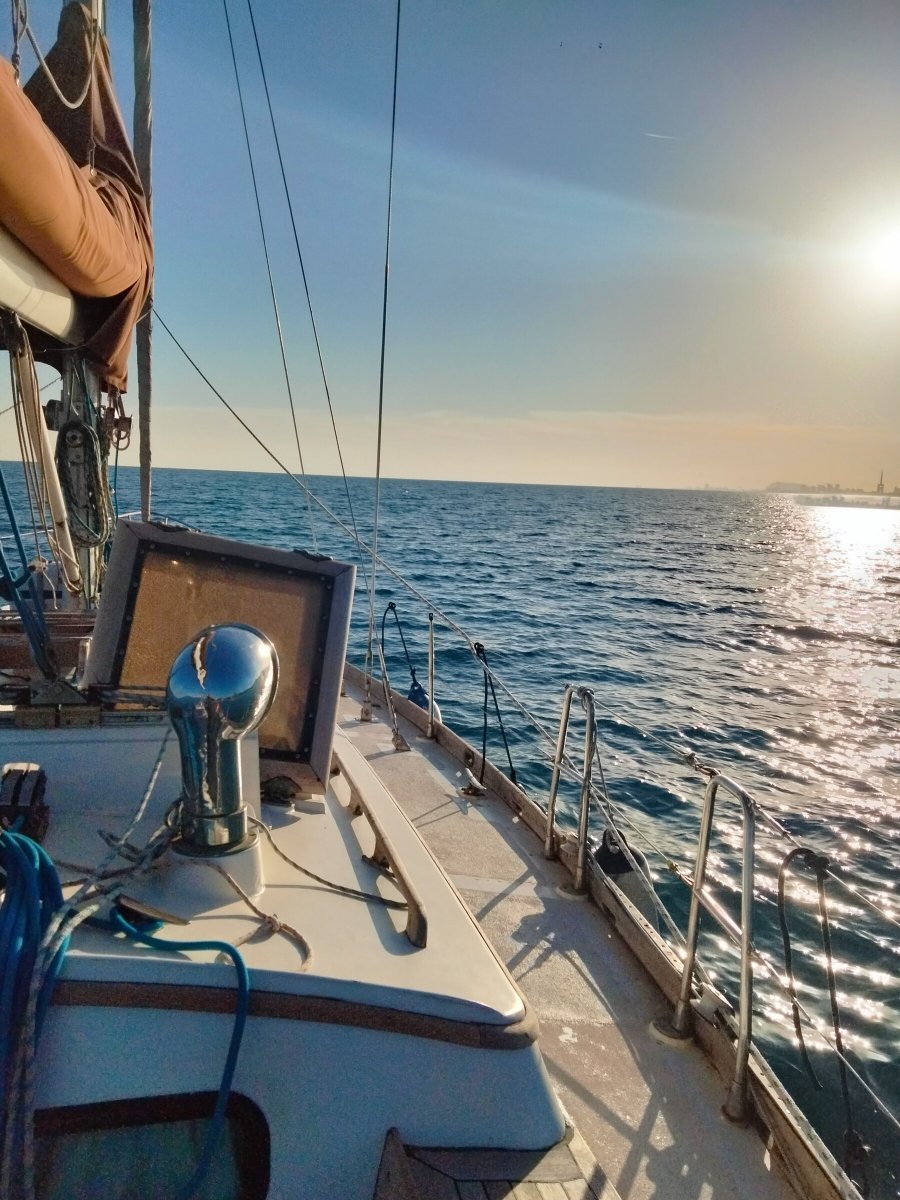 A continuación, zarpamos y, en función del viento existente, decidimos entre todos lo que más nos apetezca: costear rumbo a Barcelona, viendo la skyline de la ciudad y reconociendo desde el mar puntos de referencia, navegar hacia el norte, viendo la costa del maresme con el parque natural y las montañas de fondo (Montserrat, el Montseny, el corredor...) o navegar mar adentro, perder la costa de vista y buscar delfines, que siempre vienen a visitarnos.