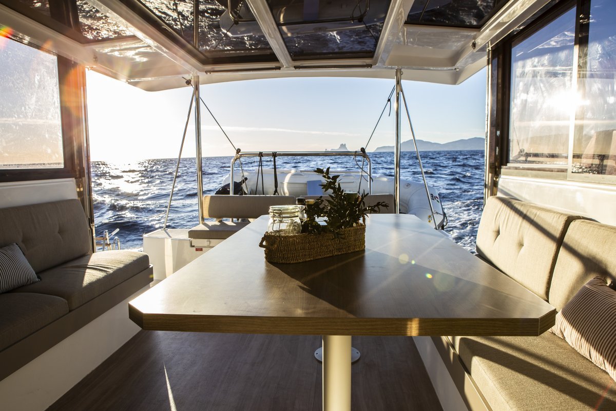 - Embarque en Sant Antoni de Portmany (Ibiza). Durante el check in, descubriremos los aspectos técnicos en cuanto a equipamiento (2 motores, potabilizadora, aire acondicionado, generador) y amarre de estas embarcaciones. Visitaremos otros modelos de catamaranes para conocer sus peculiaridades.