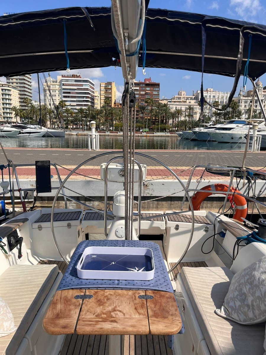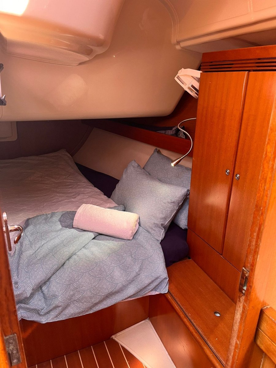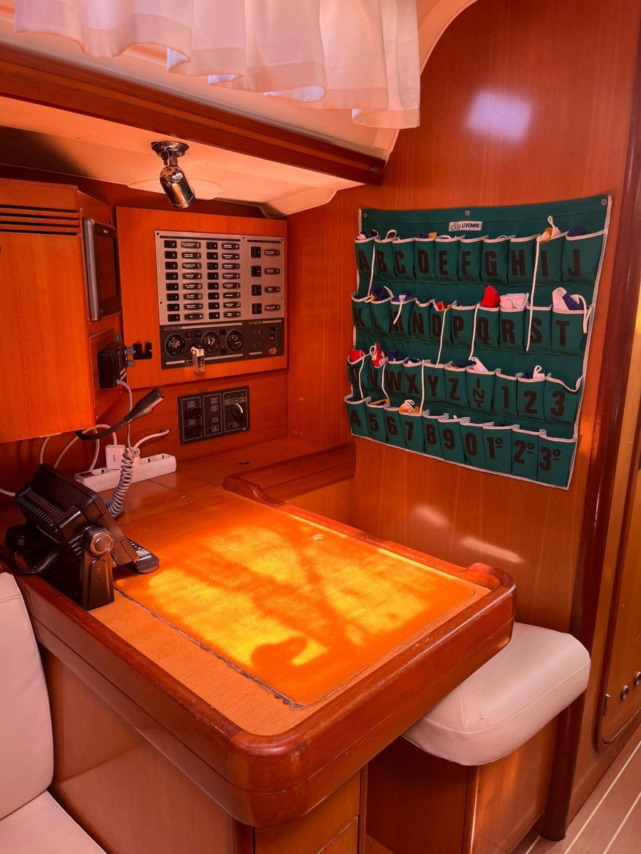 Un crucero-regata cómodo y rápido con 3 camarotes y 2 aseos, mesa en bañera y bimini con extensiones, radio-CD con altavoces, . Dispone de génova enrollable, mayor con sables con lazy bag. Quilla larga de plomo, instalación de 12v y 220v con toma a tierra, cubierta de teka, ...