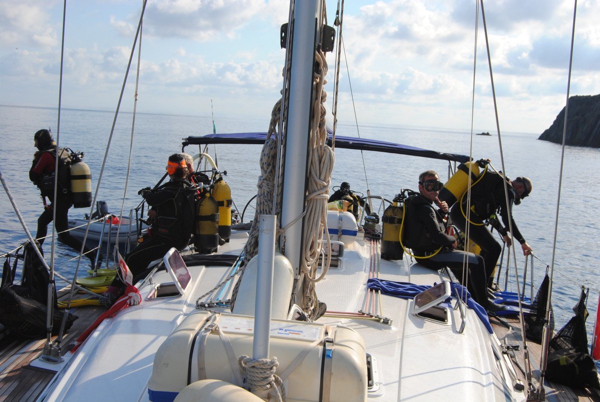 Un velero preparado para poder realizar inmersiones: compresor, equipos de buceo, embarcación auxiliar, etc...